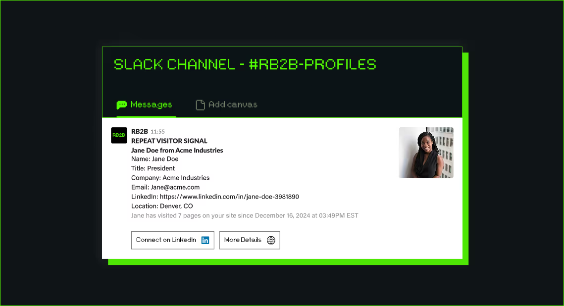 CRM and Slack Integrations: RB2B connects directly with tools like HubSpot, Salesforce, and Slack, allowing identified visitors to be routed instantly into existing sales workflows.