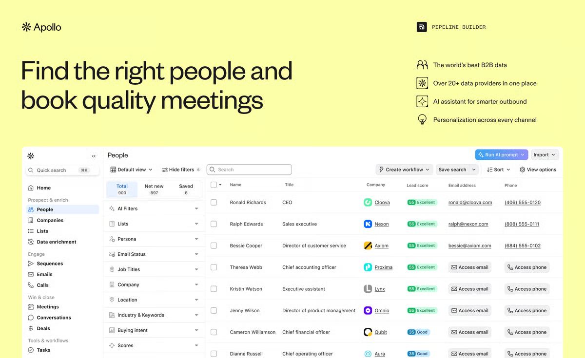 Contact and Company Data: The platform provides access to business emails, mobile numbers, firmographics, and company insights.