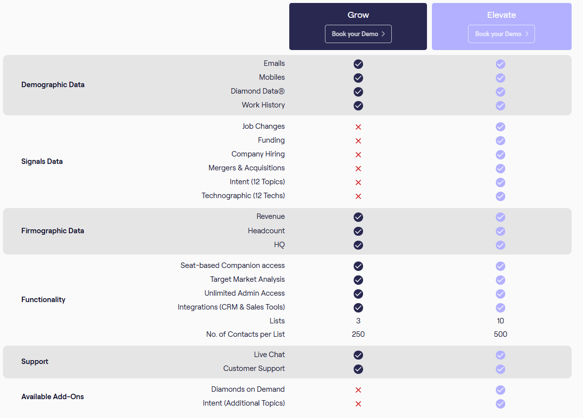 Cognism has two main plans, Grow and Elevate, both of which are based on a custom pricing model. Although every tier is meant to accommodate various levels of sales maturity, constraints and additional expenses may complicate the ability of teams to know the actual value at the outset.