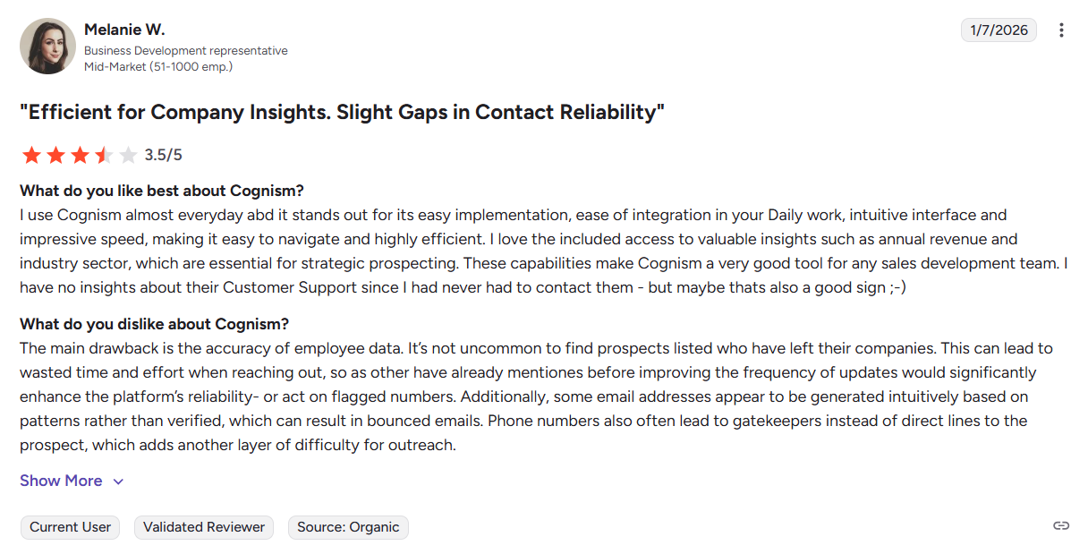 On paper, Cognism offers many of the components enterprise sales teams look for. In practice, however, access to some advanced capabilities, such as deeper intent signals and expanded data coverage, is typically restricted to higher pricing tiers. User reviews also frequently point to stronger data reliability in EMEA than in other regions, which can affect usefulness for globally distributed or North America–focused teams.