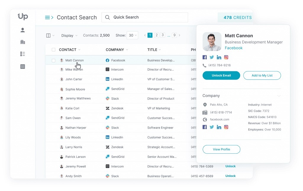 UpLead’s database is larger than Hunter.io’s, counting over 155 million contacts and 14 million business profiles.