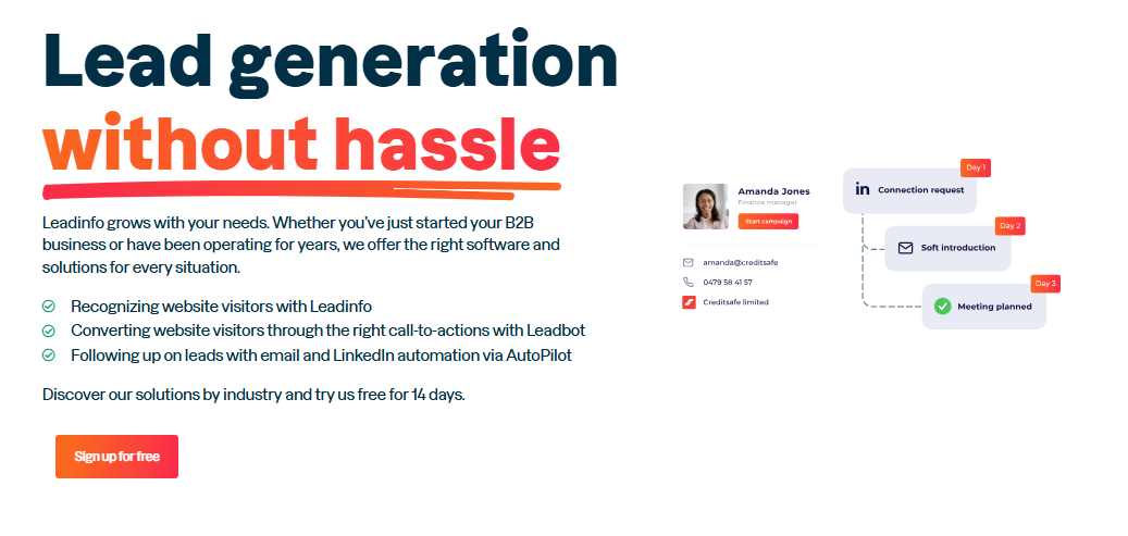 As a B2B sales lead generation tool, Leadinfo helps teams identify which companies are visiting their website, which content they engage with, and how those visits tie back to campaigns. It brings visitor recognition, company identification, and basic follow-up tools into a single platform, making it especially popular with marketing teams.