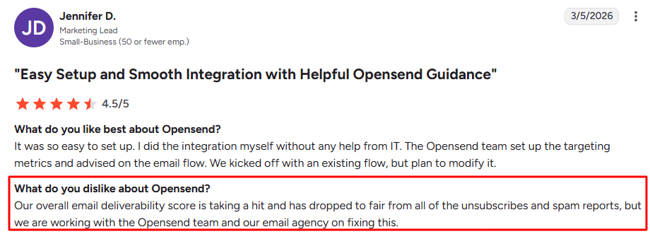 Retargeting visitors who never explicitly opted in can create deliverability problems. One G2 reviewer shared: "Our overall email deliverability score is taking a hit and has dropped to fair from all of the unsubscribes and spam reports."