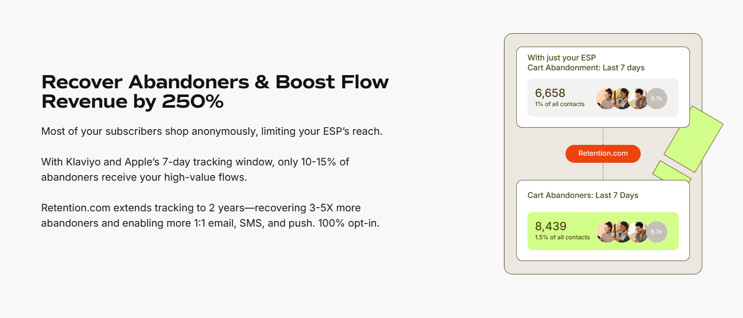 The platform's strength lies in high match rates for e-commerce traffic and its deep Klaviyo integration. For high traffic, Retention.com automatically captures bouncing visitors and triggers browse or cart abandonment flows.