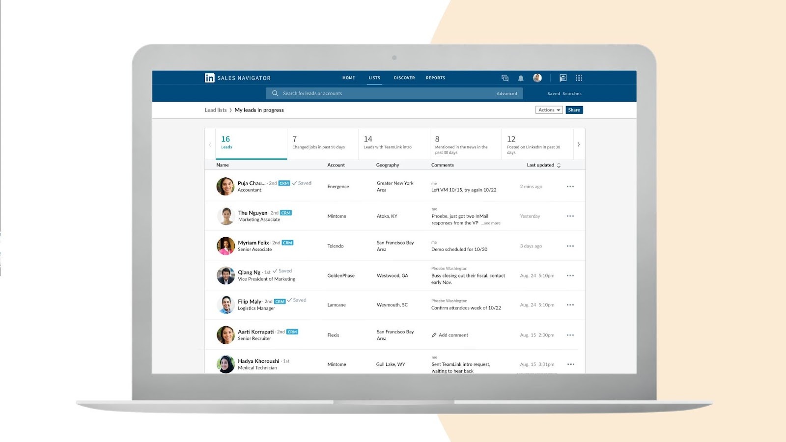 A tool that needs no introduction, LinkedIn Sales Navigator leverages its large professional network (60+ million) to connect you with the right people. It offers an array of information and tools, such as: