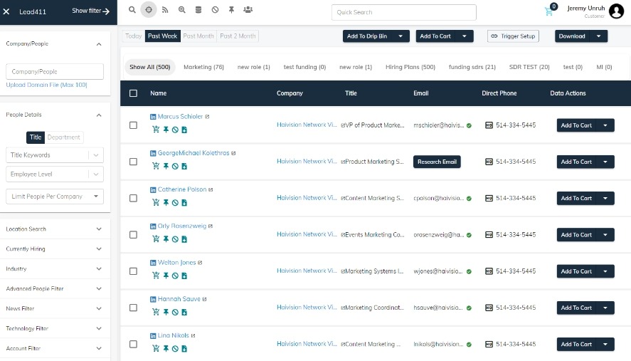 Seamless.AI gives you leads along with their phone numbers, email addresses, and direct dials. What makes it unique is that it’s the only real-time search engine. Most other platforms, ZoomInfo included, have pre-built databases that can become stale quickly.