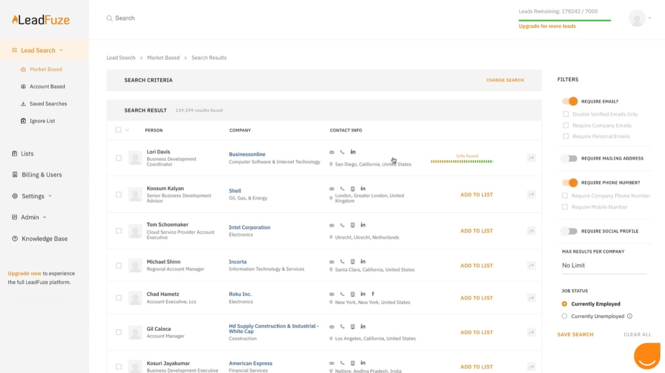 As for the downsides, I’ve noticed that LeadFuze’s reach beyond the U.S. is limited. Also, it only lets you upload a small number of leads at a time, so it’s not ideal for large-scale sales operations.